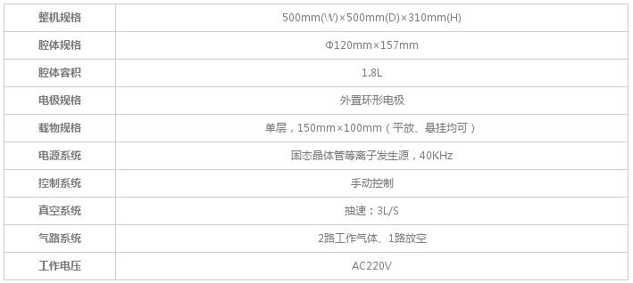 1)技術參數(shù):2)產(chǎn)品特點:ü臺式結構,真空泵外置。ü高強度石英石玻璃腔體,易清潔、耐腐蝕。ü置物方式多樣化,可平放、可懸掛。ü外置環(huán)形電極,有效避免對腔體內(nèi)的污染。3)應用范圍:...